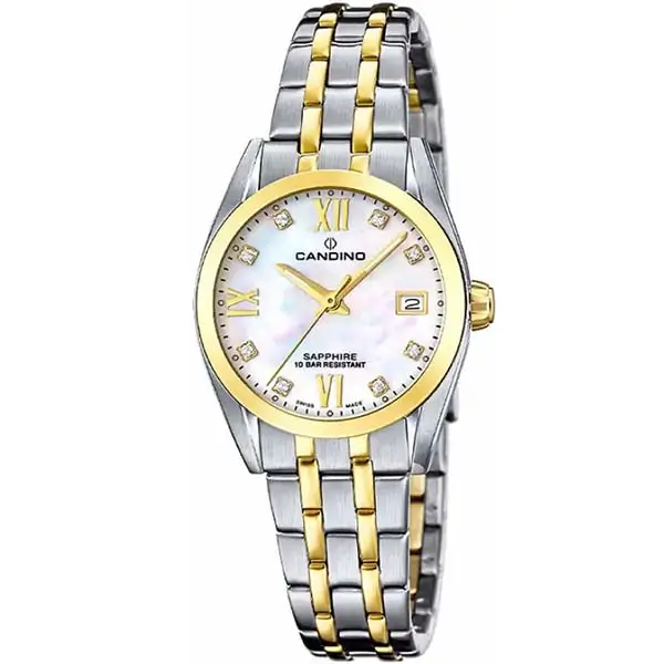 - ساعت کاندینو C4704/E یک مدل زنانه کوارتز سوئیسی لوکس است که با قاب و بند استیل دو رنگ (نقرهای و طلایی)، جلوهای کلاسیک و چشمنواز دارد. صفحه این ساعت از صدف طبیعی سفید است که نوری خیرهکننده و ظریف دارد و زیبایی طبیعی آن را دوچندان میکند. مجهز به شیشه سافایر ضد خش است که دوام و شفافیت ساعت را حفظ میکند و دارای نمایشگر کاربردی تقویم روز است. این مدل با مقاومت در برابر آب تا 100 متر، یک گزینه بسیار مطمئن و بادوام برای استفاده روزانه، حتی در تماس با آب است.