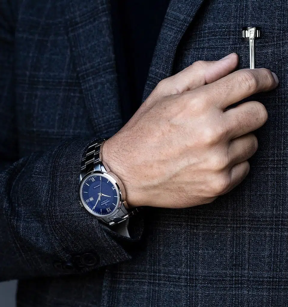 - ترکیبی از صفحه سرمهای تیره و بدنه نقرهای، یک استایل رسمی و در عین حال روزمره ایجاد میکند که هرگز از مد نمیافتد.