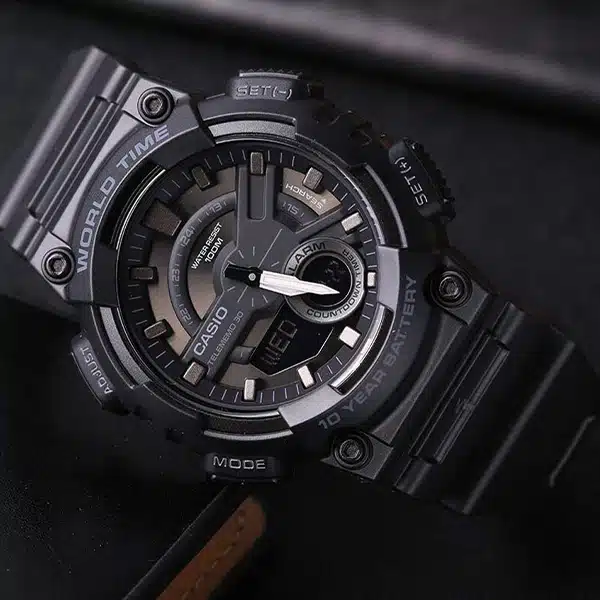 ساعت مچی کاسیو AEQ-110W-1BVDF، همراهی ایدهآل برای سبک زندگی فعال شماست. این ساعت با طراحی مقاوم و الهامگرفته از سری G-SHOCK، ظاهری اسپرت و جذاب دارد. امکانات کاربردی آن از جمله مقاومت در برابر آب تا ۱۰۰ متر، عمر باتری ۱۰ ساله و ساعت جهانی، آن را به انتخابی عالی برای استفاده روزمره، ورزش و مسافرت تبدیل میکند. صفحهی ترکیبی آنالوگ و دیجیتال، همراه با قابلیتهایی مانند کرنومتر و آلارم، هر آنچه نیاز دارید را در اختیار شما قرار میدهد. اگر به دنبال ساعتی بادوام، شیک و پرکاربرد هستید، AEQ-110W-1BVDF بهترین گزینه است.