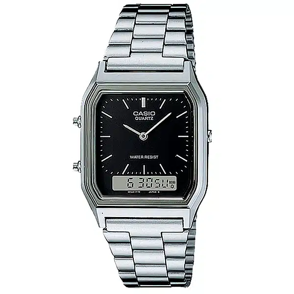 ساعت مچی کاسیو با رفرنس AQ-230A-1DMQ، ترکیبی بینظیر از سبک کلاسیک و امکانات مدرن است. این ساعت با طراحی دوگانه آنالوگ و دیجیتال، صفحهای مستطیلشکل و بدنهای نقرهای از جنس استیل، ظاهری نوستالژیک و جذاب را به نمایش میگذارد. بند استیل ضدزنگ و سبک آن، راحتی را در تمام طول روز تضمین میکند.