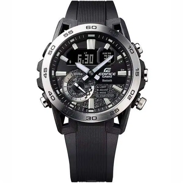 ساعت کاسیو EDIFICE مدل ECB-40P-1ADF یک ساعت هیبریدی آنالوگ-دیجیتال با طراحی الهامگرفته از موتوراسپورت (سری Sospensione) است که از قاب تقویتشده با فیبر کربن و فولاد، بند رزینی و شیشه مینرال برخوردار است و ابعاد بدنه حدود 52.4×48×12.7 میلیمتر با وزن تقریبی 65 گرم دارد. این مدل قابلیتهای هوشمند مانند اتصال بلوتوث با اپلیکیشن برای تنظیم خودکار زمان، پیدا کردن گوشی و تنظیم آسان، همراه با امکانات ساعت جهانی، کرنومتر تا 1/1000 ثانیه و تایمر را ارائه میدهد. همچنین دارای نور پسزمینه Super Illuminator، قابلیت جابجایی عقربهها برای دید بهتر (hand shift) و مقاومت تا 100 متر در برابر آب است. منبع انرژی این ساعت باتری معمولی (CR2016) با عمر حدود ۲ سال است. این ساعت را میتوانید همراه با فاکتور اصالت و قیمت کالا از فروشگاه حضوری و آنلاین کرنوواچ تهیه کنید.