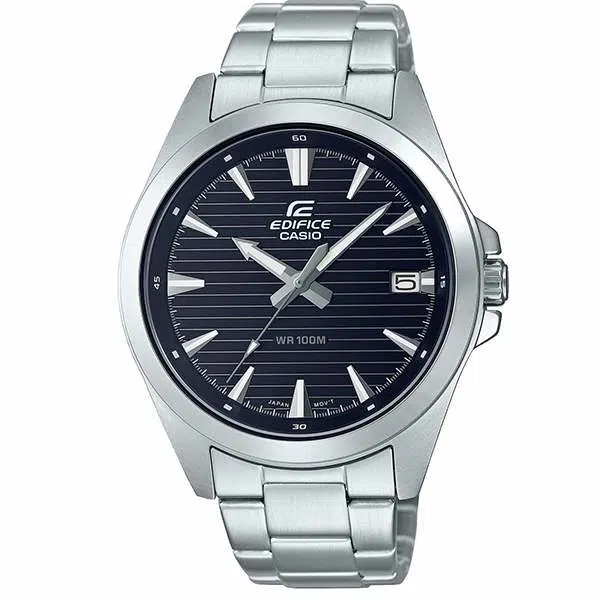 ساعت مچی کاسیو (CASIO) مدل EFV-140D-1AVUDF یک انتخاب ایدهآل برای کسانی است که به دنبال ترکیبی از طراحی اسپرت و کلاسیک با کارکرد دقیق هستند. این مدل با صفحه مشکی ساده و خوانا و عقربههای شبتاب (Luminous Hands) جلوهای مدرن و جذاب دارد. قاب و بند از جنس استیل ضدزنگ (Stainless Steel) ساخته شده که مقاومت و دوام بالایی را تضمین میکند. مقاومت آب تا عمق 100 متر (100M Water Resistant) به شما اجازه میدهد بدون نگرانی در فعالیتهای روزمره و حتی شنا از آن استفاده کنید. موتور کوارتز دقیق این ساعت، زمانسنجی مطمئن و دقیق را برای کاربر فراهم میکند. این ساعت را همراه با فاکتور اصالت و قیمت کالا میتوانید از فروشگاه آنلاین و حضوری کرنوواچ تهیه کنید.⚙️ مشخصات فنی ساعت کاسیو مدل EFV-140D-1AVUDF: