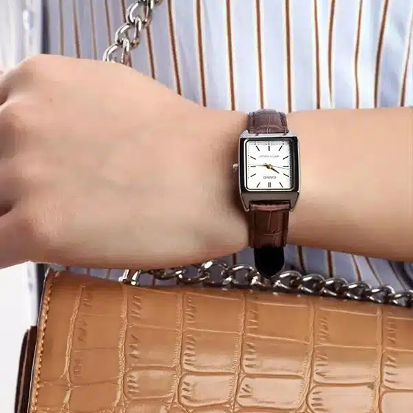 - فرم مستطیلی قاب و بند چرمی قهوهای، ظاهری ساده و در عین حال شیک به آن بخشیده که به راحتی با استایلهای مختلف، از روزمره تا رسمی، ست میشود.