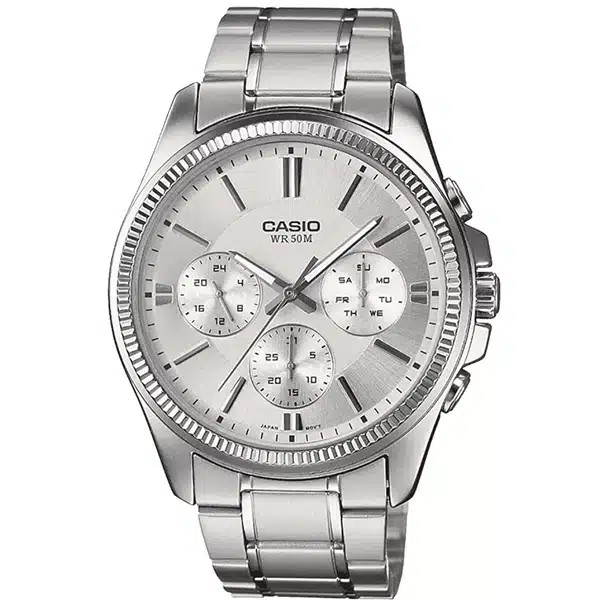 ساعت مچی کاسیو MTP-1375D-7AVDF، انتخابی جسورانه و متفاوت برای آقایان. این ساعت با صفحه خاص و جذاب سفید رنگ، در کنار بدنهی استیل ضد زنگ، ظاهری مدرن و در عین حال کلاسیک ارائه میدهد. سه صفحه فرعی کاربردی برای نمایش روز، تاریخ و ساعت ۲۴ ساعته، آن را به ابزاری کامل تبدیل کرده است. مقاومت در برابر آب تا عمق ۵۰ متر، خیال شما را از بابت استفاده روزمره آسوده میکند. MTP-1375D-7AVDF ساعتی است برای کسانی که میخواهند از روزمرگی فاصله بگیرند و سبکی متمایز را تجربه کنند.⚙️ مشخصات فنی ساعت کاسیو مدل MTP-1375D-7AVDF: