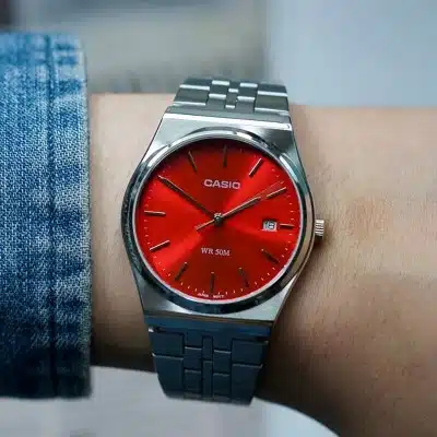 - عقربهها و نشانگرهای نقرهای رنگ روی صفحه قرمز، کنتراست مناسبی ایجاد کرده و خواندن زمان را آسان میکنند.