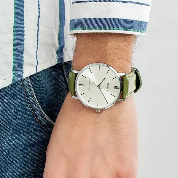 ساعت مچی مردانه کاسیو MTP-VT01L-3BUDF از سری Casio General، انتخابی ایدهآل برای آقایانی است که به دنبال یک ساعت کلاسیک، شیک و مینیمال برای استفاده روزمره هستند.MTP-VT01L-3BUDF با طراحی ساده، قطر 40 میلیمتری و ضخامت کم (8.2 میلیمتر)، ظاهری تمیز و بدون شلوغی ارائه میدهد. صفحه نقرهای درخشان آن در کنار بند چرمی سبز زیتونی، ترکیبی خاص و چشمنواز ایجاد کرده که به راحتی با استایلهای غیررسمی و نیمهرسمی شما ست میشود.این ساعت با تکیه بر موتور کوارتز ژاپنی کاسیو، دقت و دوام بالا را تضمین میکند و بهترین گزینه برای کسانی است که به دنبال یک ساعت باکیفیت و قیمت مناسب، با تمرکز بر زیبایی و سادگی هستند.
