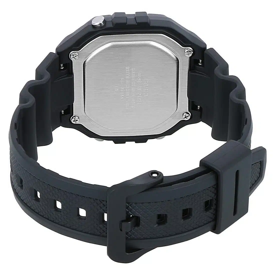 - جنس بدنه و بند ساعت از رزین (Resin) است که یک ماده پلاستیکی بسیار بادوام و سبک است. این ماده معمولاً ضدحساسیت بوده و برای پوستهای حساس مشکلی ایجاد نمیکند.