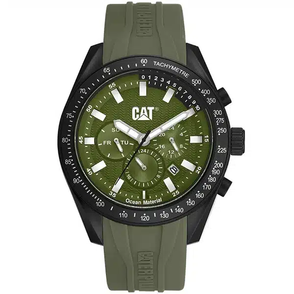 - ترکیب رنگ سبز زیتونی صفحه و بند با قاب مشکی، ظاهری الهام گرفته از تجهیزات سنگین کاترپیلار به آن میبخشد که برای علاقهمندان به سبکهای اسپرت و صنعتی بسیار جذاب است. جزئیات شبنما نیز به خوانایی در نور کم کمک میکند.