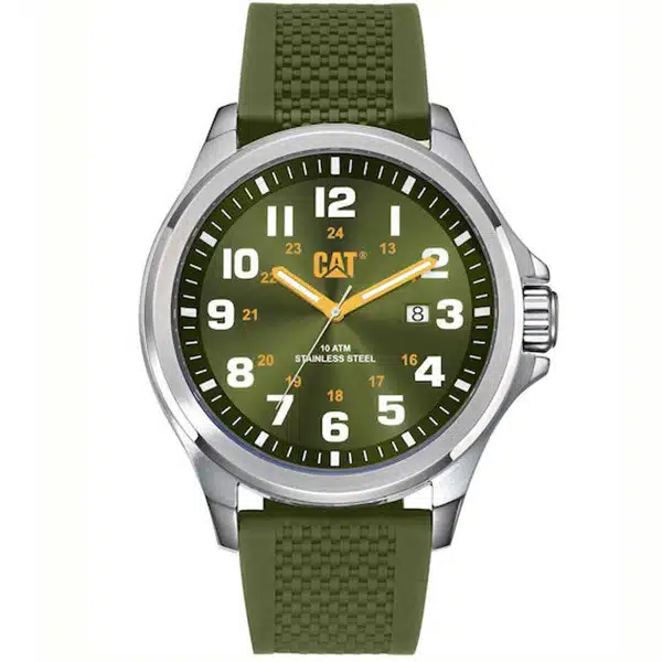 - طراحی این ساعت بسیار مردانه و اسپرت است. ترکیب رنگ نقرهای قاب، بند و صفحهی سبز با جزئیات زرد رنگ در صفحه (شامل لوگو و نشانگرها) به ساعت ظاهری پویا و جذاب میبخشد که هویت برند کاترپیلار را به خوبی نمایان میکند. این ساعت برای استایلهای کژوال، ورزشی و روزمره عالی است.