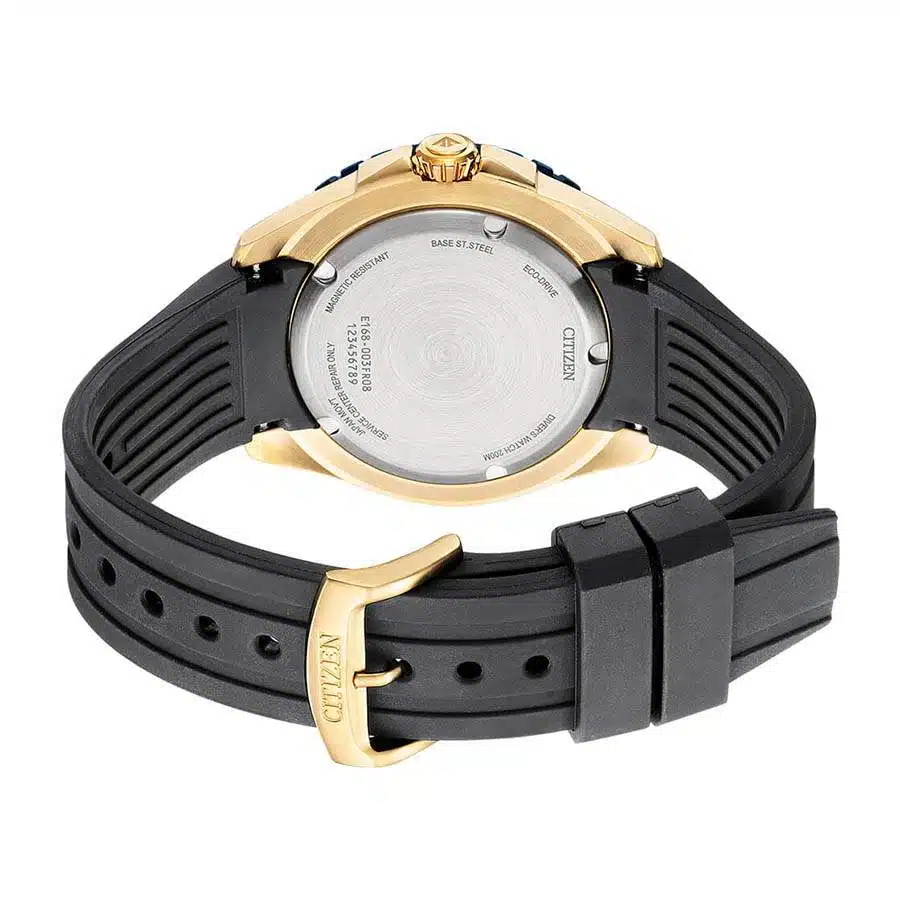 نوع موتور: Eco-Drive (شارژ نوری) با کالیبر E168 (کوارتز خورشیدی ژاپنی) ذخیره انرژی (Power Reserve): تقریباً 6 ماه با شارژ کامل (در تاریکی کامل) قابلیتها: هشدار کمبود شارژ، جلوگیری از شارژ بیش از حد جنس قاب: استیل ضد زنگ (Stainless Steel) با آبکاری دو رنگ (Two-Tone) رزگلد و آبی (یا مشکی) روی بزل قطر قاب: 45.9 میلیمتر ضخامت قاب: 11 میلیمتر پشت قاب (Case Back): پیچی (Screw-back case) برای افزایش مقاومت در برابر آب تاج کوک (Crown): پیچی (Screw-down crown) برای افزایش مقاومت در برابر آب جنس شیشه: کریستال معدنی (Mineral Crystal) که مقاوم در برابر ضربه و شکستگی رنگ صفحه: آبی تیره (Dark Blue / Navy) جنس بند: رزین/پلییورتان (Resin / Polyurethane) رنگ بند: مشکی نوع قفل: سگکی (Standard Buckle / Tang Buckle)مقاومت در برابر آب (Water Resistance): 200 متر (20 بار / 660 فوت) دارای استاندارد ISO Compliant (مطابق با استانداردهای بینالمللی ساعتهای غواصی ISO 6425) که مناسب برای غواصی حرفهای است