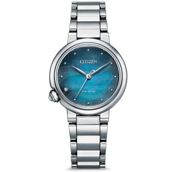 ساعت Citizen EM0910-80N با بدنه و بند استیل ضد زنگ نقرهای رنگ، به خوبی حس لوکس بودن را منتقل میکند. صفحهی آن با رنگ خاص آبی صدفی (Mother of Pearl) طراحی شده که در زوایای مختلف، جلوهای متفاوت و چشمنواز ایجاد میکند.