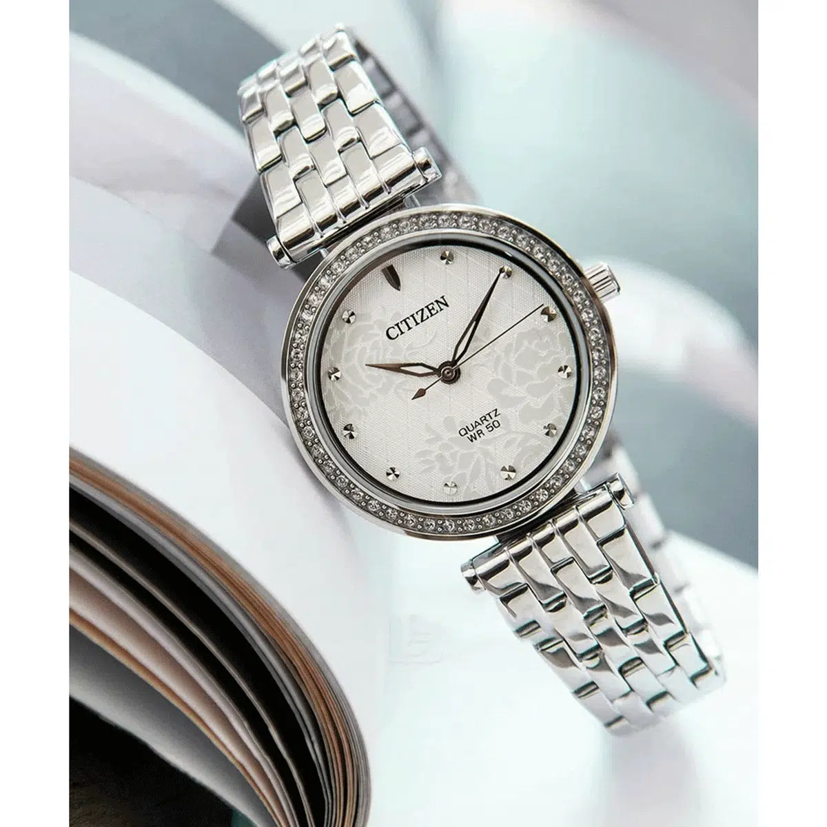 - این ساعت زنانه سیتیزن با طراحی مینیمال و رنگ نقرهای، ظاهری بسیار شیک و همهکاره دارد. این سادگی باعث میشود که ساعت هرگز از مد نیفتد و به راحتی با هر نوع پوششی، از لباسهای روزمره گرفته تا استایلهای رسمی، ست شود.