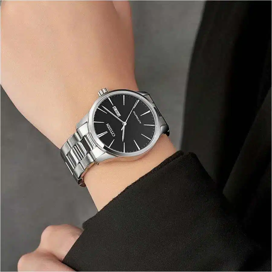 - یکی از بزرگترین مزیتهای این ساعت از برند سیتیزن، موتور اتوماتیک آن است. این یعنی ساعت انرژی مورد نیاز خود را از حرکت طبیعی مچ دست شما تأمین میکند و دیگر نیازی به تعویض دورهای باتری و مراجعه به ساعتفروشی نخواهید داشت. این ویژگی نه تنها از نظر اقتصادی مقرون به صرفه است، بلکه حس اصالت و مهارت ساخت ساعتسازی سنتی را نیز به همراه دارد.