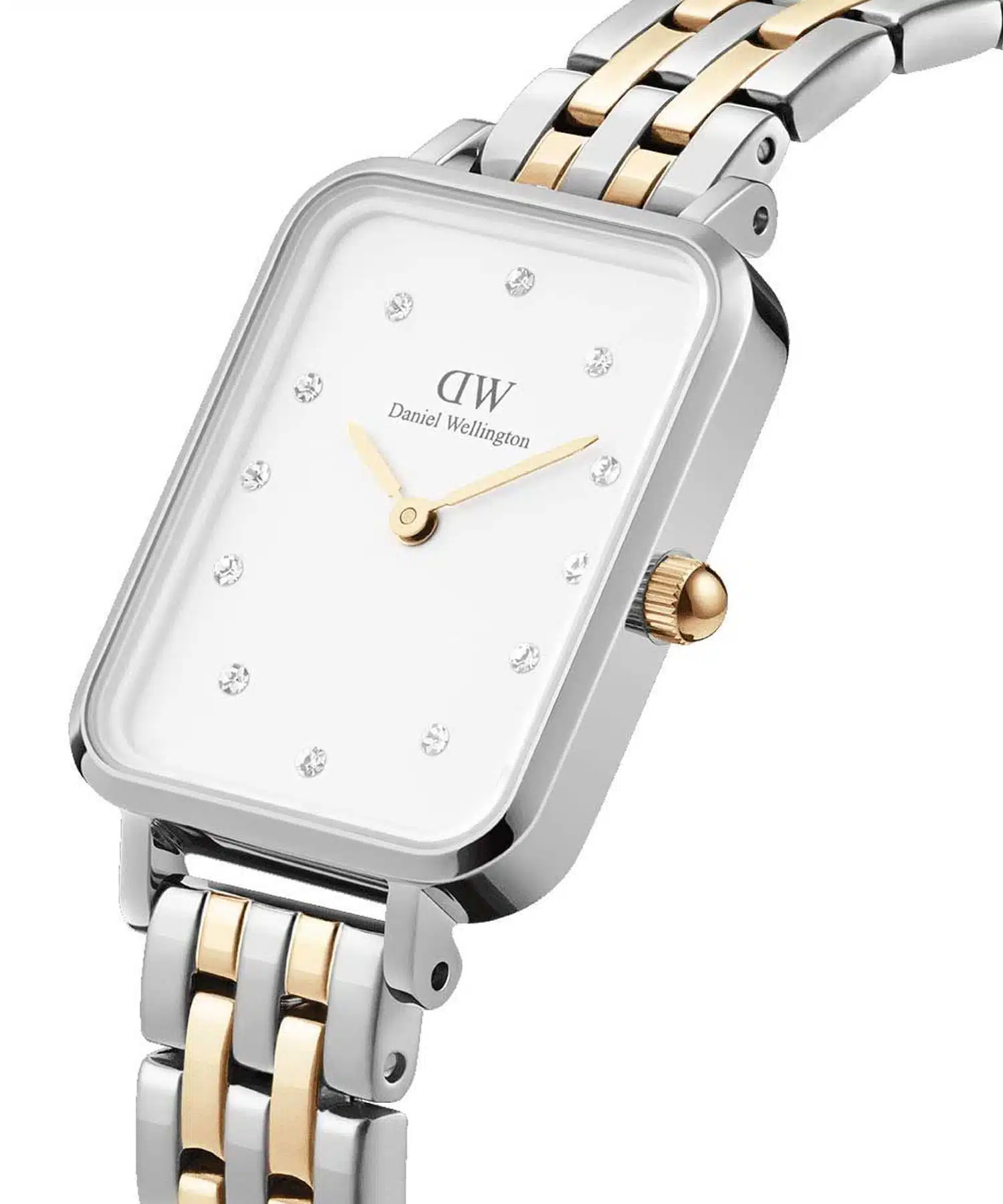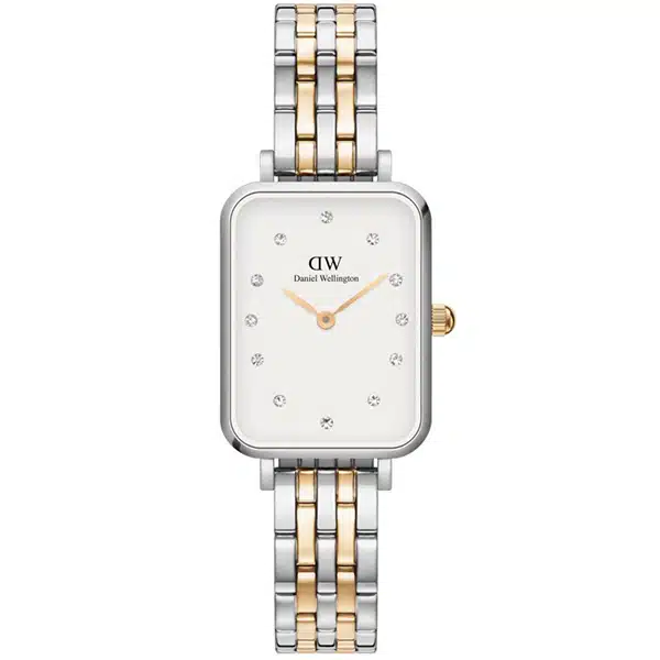 ساعت مچی دنیل ولینگتون DW00100625 یک ساعت زنانه مینیمال و مجلسی با قاب مستطیلی (20×26 mm) نقرهای و صفحه سفید مزین به نگینهای اتمی (یا سواروفسکی) به جای نشانگرهای ساعت است؛ این ساعت با بند فلزی ۵-بندی (Link) دو رنگ (نقرهای و طلایی)، یک ترکیب لوکس و چشمنواز با تم جواهری را ارائه میدهد. با خرید ساعت مچی زنانه از فروشگاه کرنوواچ با دریافت گارانتی شرکتی و فاکتور اصالت کالا خریدی مطمئن را تجربه کنید.