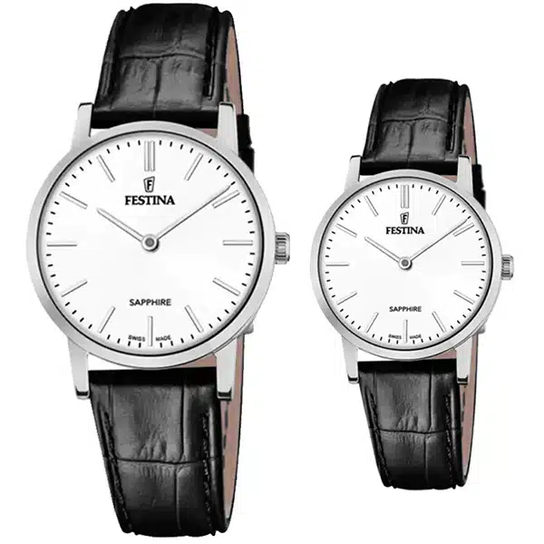 ست ساعت مچی فستینا مدلهای F20012/1 و F20013/1، یک مجموعه کلاسیک و هماهنگ از سری Swiss Made این برند است که با تمرکز بر ظرافت و کیفیت بالا طراحی شده است؛ مدل مردانه با قطر 40 میلیمتر و مدل زنانه با قطری ظریفتر حدود 29 میلیمتر، هر دو دارای قاب استیل نقرهای، بند چرمی مشکی و صفحه ساده و تمیز سفید رنگ هستند که با بهرهگیری از شیشه یاقوت کبود (Sapphire Crystal) ضد خش و موتور کوارتز، ترکیبی از دقت، دوام و استایل رسمی را برای زوجها فراهم میکنند و تا عمق 50 متر هم در برابر آب مقاوم هستند.