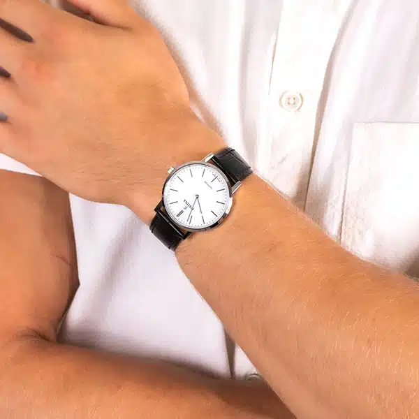 - این ست با صفحهی سفید ساده (مینیمال) و بند چرمی مشکی، ظاهری رسمی، شیک و جاودانه دارد که کاملاً برای ست شدن استایل زوجها در موقعیتهای مجلسی و کاری مناسب است.