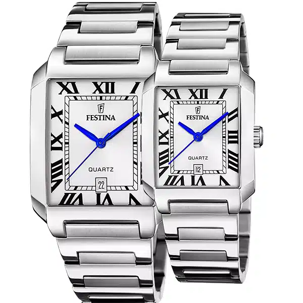 ساعتهای فستینا مدل F20677/1 (مردانه) و F20679/1 (زنانه) یک ست ساعت کلاسیک از کالکشن “On the Square” هستند که بر اساس طراحی مستطیلی/چهارگوش مشترک و ظریف خود شناخته میشوند؛ هر دو مدل از موتور کوارتز بهره میبرند و دارای بدنهای از جنس استیل ضد زنگ و بند فلزی یکپارچه، صفحه نقرهای با نمایشگر تاریخ و شیشه معدنی (Mineral Crystal) هستند؛ مدل مردانه دارای قطر قاب 40 میلیمتری و مدل زنانه دارای قطر قاب کوچکتر 34 میلیمتری است و هر دو دارای مقاومت در برابر آب تا 50 متر برای استفاده روزمره هستند که آنها را به یک انتخاب شیک و هماهنگ برای زوجها تبدیل میکند.