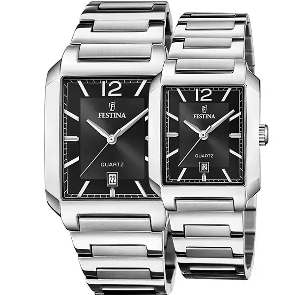 ساعتهای ست کلاسیک فستینا مدل F20677/4 (مردانه) و F20679/4 (زنانه) از زیرمجموعه “On the Square”، با طراحی قاب مستطیلی یا چهارگوش متمایز و بند فلزی استیل نقرهای، یک انتخاب شیک و هماهنگ برای زوجها هستند؛ این دو ساعت از نظر فنی مشابه مدلهای F20677/1 و F20679/1 هستند، اما با صفحه مشکی تیره عرضه میشوند که کنتراست عالی با قاب و بند نقرهای ایجاد میکند و دارای موتور کوارتز با دقت بالا، نمایشگر تاریخ و مقاومت در برابر آب 50 متری برای استفاده روزانه میباشند؛ ابعاد مدل مردانه 40 میلیمتر و مدل زنانه 34 میلیمتر برای یک ظاهر رسمی و هماهنگ تنظیم شدهاند.