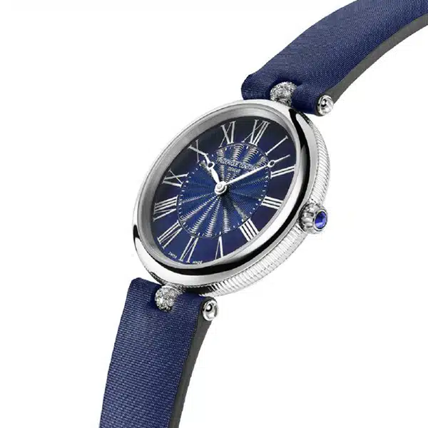 - ظاهر این مدل ساعت زنانه برگرفته از سبک هنری Art Déco است که در آن تقارن، خطوط نرم و جزئیات تجملی اهمیت زیادی دارند. قاب گرد کوچک با فرم ملایم، صفحه صدفی آبی با اعداد رومی باعث میشود این ساعت با ظاهری زنانه، هنرمندانه و کاملاً متمایز دیده شود.
