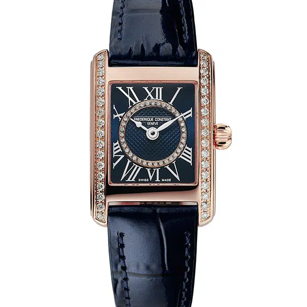 ساعت Frederique Constant FC-200NMCDCD14 با طراحی مستطیلی کلاسیک، تزئینات الماس و رنگبندی آبی و رزگلد، انتخابی ایدهآل برای بانوانی است که به دنبال ترکیبی از ظرافت، کیفیت سوئیسی و جزئیات لوکس هستند. این ساعت نه تنها یک ابزار زمانسنجی دقیق است، بلکه بهعنوان یک جواهر زیبا نیز میدرخشد.