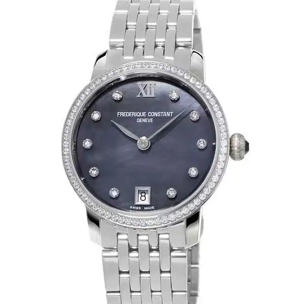 ساعت مچی فردریک کنستانت رفرنس FC-220MPBD1SD26B، انتخابی بینظیر برای خانمهایی است که به دنبال تجلی زیبایی، دقت و لوکس بودن هستند. این ساعت خیرهکننده از کالکشن Slimline فردریک کنستانت، با طراحی باریک و دلنشین خود، به راحتی بر روی مچ دست شما مینشیند و جلوهای از وقار و سلیقه بینظیر را به نمایش میگذارد. بزل (قاب دور صفحه) این ساعت زنانه با 68 تا 78 قطعه الماس درخشان تزئین شده که نور را به زیبایی بازتاب میدهد. همچنین، 10 قطعه الماس دیگر به عنوان نشانگر ساعت، بر روی صفحه صدفی مشکی رنگ (Black Mother of Pearl) قرار گرفتهاند تا جلوهای بینهایت لوکس خلق کنند.⚙️ مشخصات فنی ساعت فردریک کنستانت مدل FC-220MPBD1SD26B: