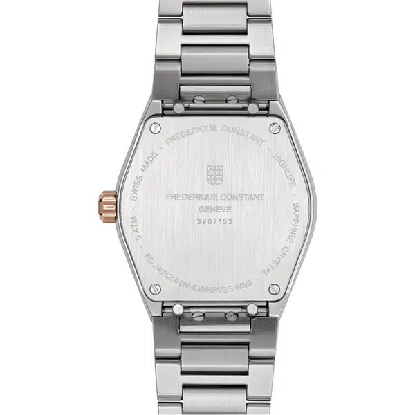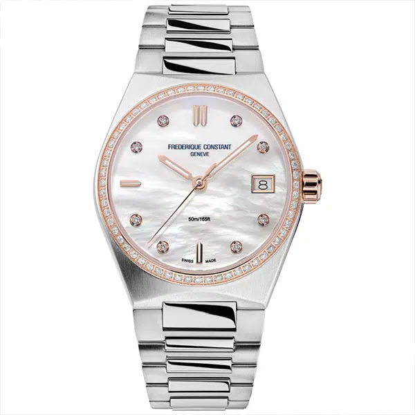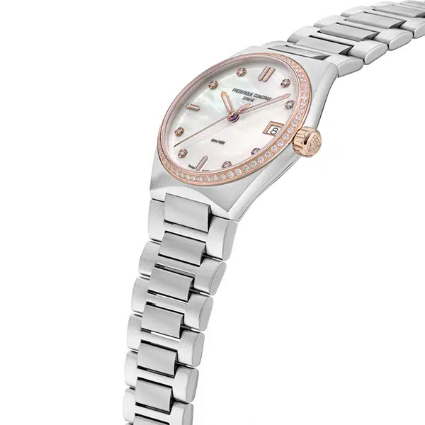 ساعت مچی فردریک کنستانت Highlife FC-240MPWD2NH22B، از استیل ضد زنگ دو رنگ (نقرهای و طلایی رزگلد) و صفحه صدف مروارید درخشان، جلوهای از لوکس بودن را به نمایش میگذارد. 8 الماس درخشان در کنار نشانگرهای طلایی، زیبایی صفحه را دوچندان کرده و آن را به اثری هنری تبدیل میکنند.