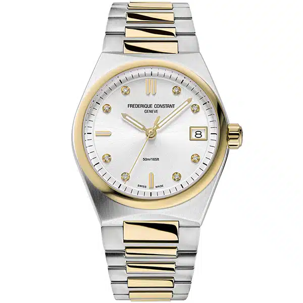 - این مدل ساعت فردریک کنستانت زنانه با قاب ۳۱ میلیمتری دو رنگ نقرهای و طلایی و صفحهی نقرهای با جلوه خورشیدی، جلوهای بسیار ظریف و شیک دارد که آن را به انتخابی ایدهآل برای مهمانیها و موقعیتهای رسمی تبدیل میکند.