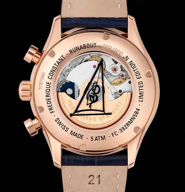 نوع موتور: مکانیکی اتوماتیک (Self-winding Mechanical) کالیبر: FC-392 (بر پایه ETA Valjoux 7750 یا Sellita SW500 با تغییرات فردریک کنستانت) تعداد جواهرات (Jewels): 25 سنگ قیمتی ذخیره انرژی (Power Reserve): 55 ساعت فرکانس (Frequency): 28,800 نوسان در ساعت (4 هرتز) قابلیتها: نمایش ساعت، دقیقه، ثانیه (در شمارنده فرعی)، تاریخ، کرونوگراف (شامل شمارندههای 12 ساعته، 30 دقیقهای و ثانیهشمار مرکزی) جنس قاب: استیل ضد زنگ 316L با روکش PVD رزگلد (Rose Gold PVD Plated Stainless Steel) قطر قاب: 42 میلیمتر ضخامت قاب: تقریباً 13.5 میلیمتر (ممکن است کمی متفاوت باشد) فرم قاب: گرد شیشه (Crystal): سافایر گنبدی (Domed Sapphire Crystal) مقاوم در برابر خش با پوشش ضد انعکاس (Anti-reflective coating) قاب پشتی (Case Back): شفاف (See-through) از جنس سافایر، با حکاکیهای مخصوص نسخه محدود و پرچم RHS (انجمن تاریخی Riva) دسته کوک (Crown): فشاری (Push/Pull) رنگ صفحه: آبی تیره (Dark Blue) طرح صفحه: گیلوچه (Guilloché) در مرکز نشانگرهای ساعت (Indices): نشانگرهای خطی رزگلد با پوشش شبتاب (Luminous) عقربهها (Hands): عقربههای رزگلد با پوشش شبتاب شمارندههای فرعی (Sub-dials): سه شمارنده برای کرونوگراف:-