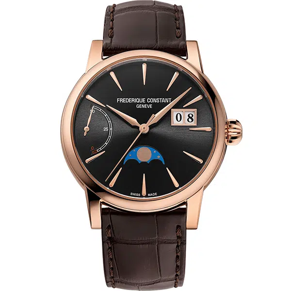 ساعت مچی فردریک کنستانت FC-735G3H9، گوهری از مجموعه “Manufacture Classic Power Reserve Big Date”، انتخابی بینظیر برای آقایان باسلیقه است. این ساعت با قاب 40 میلیمتری از طلای رز 18 عیار و صفحه خاکستری سانری، درخشش و ظرافتی خیرهکننده دارد. موتور این-هاوس FC-735 با 50 ساعت ذخیره انرژی، تقویم بزرگ و نمایشگر فاز ماه، دقیقترین عملکردهای مکانیکی را ارائه میدهد. بند چرمی کروکودیل قهوهای و شیشه سافایر ضد خش، لوکس بودن این مدل محدود 350 عددی را تکمیل میکند. FC-735G3H9 بیش از یک ساعت، نمادی از هنر ساعتسازی سوئیسی و اوج ظرافت مردانه است.