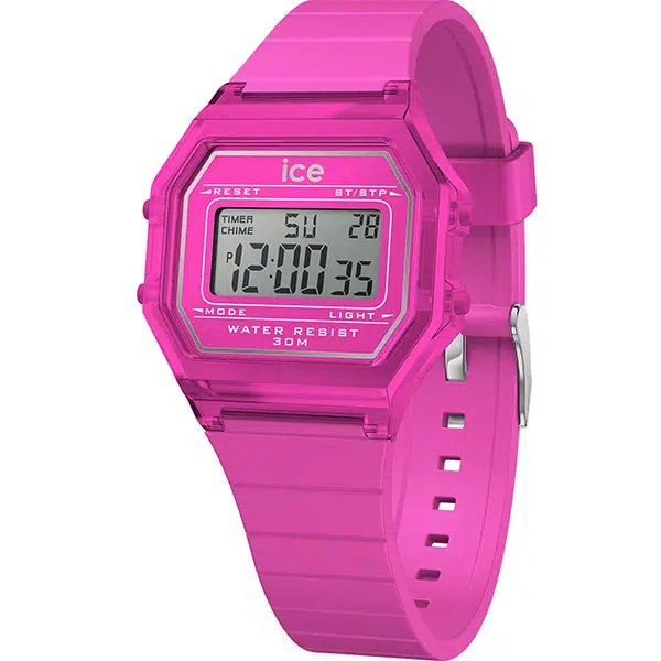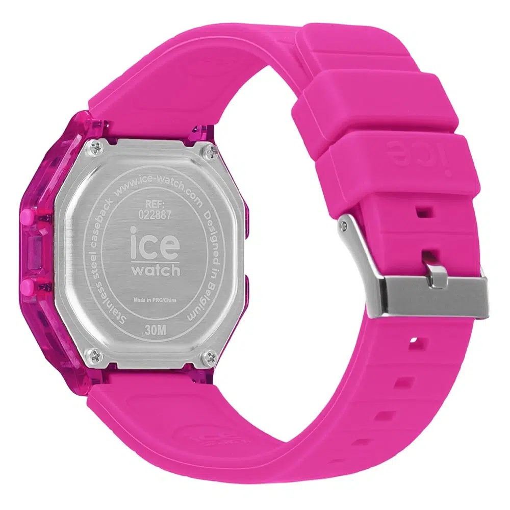 ساعت آیس واچ مدل 022887 یک ساعت دیجیتال زنانه است. این مدل دارای بند و قاب از جنس سیلیکون در رنگ صورتی و قطر قاب 33 میلیمتر (سایز کوچک) میباشد؛ ویژگیهای اصلی آن شامل نمایشگر دیجیتال، تقویم، کرنومتر، زنگ هشدار و چراغ پسزمینه است که با وجود مقاومت کم (30 متر) در برابر آب، به دلیل سبکی (26 گرم)، دوام بالا و طراحی شاداب، برای استفاده روزمره و استایلهای کژوال بسیار محبوب است.