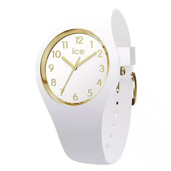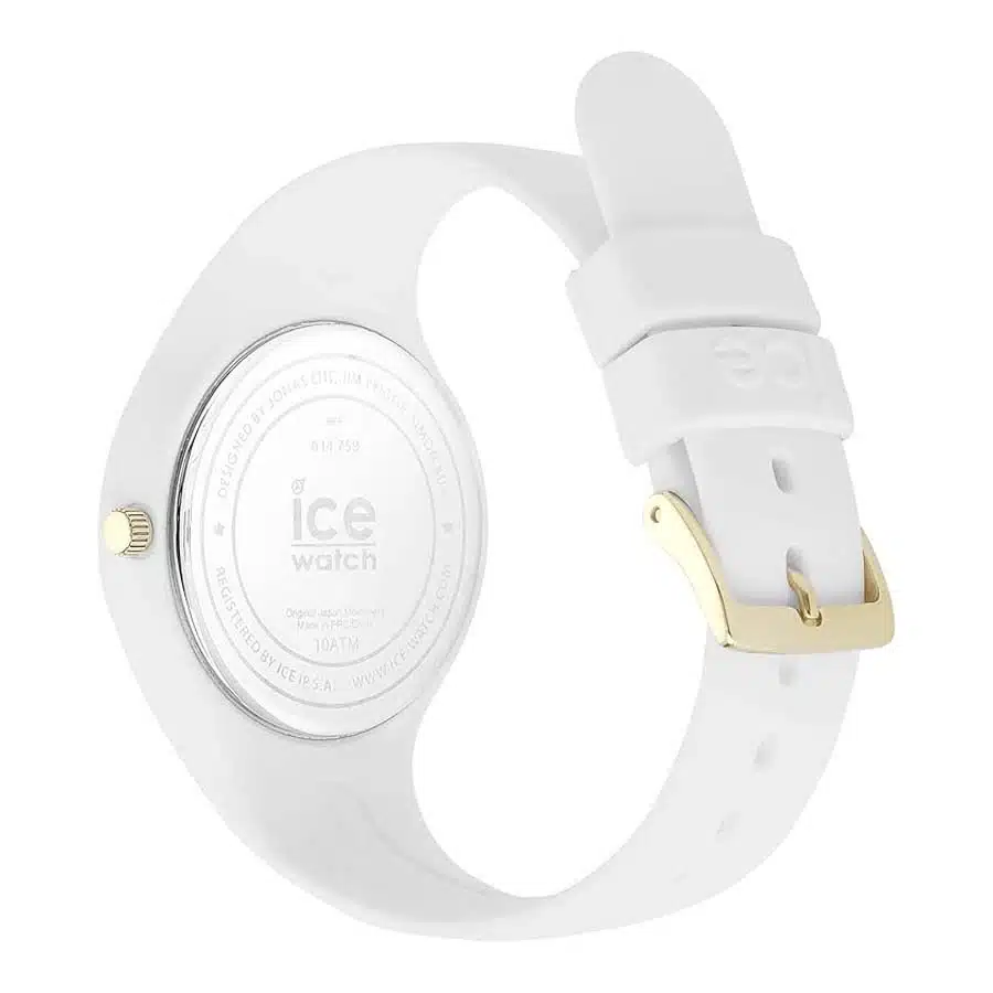 ساعت آیس واچ مدل 014759 یک ساعت زنانه اسپرت و روزمره با قاب و بند سیلیکونی سفید به قطر 35 میلیمتر است که دارای صفحه ساده سفید با جزئیات و نشانگرهای طلایی میباشد؛ این مدل آنالوگ کوارتز، به دلیل سادگی رنگ و مقاومت بالا در برابر آب تا 100 متر، برای استفاده روزانه، ورزشی و شنای سبک مناسب است.