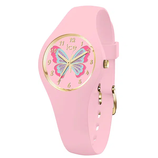 - ساعت آیس واچ مدل 021955 یک ساعت دخترانه و زنانه با سایز کوچک است که دارای قاب گرد و بند یکپارچه سیلیکونی صورتی به قطر 34 میلیمتر میباشد؛ ویژگی اصلی آن صفحه شاد و چند رنگ است که با طرح فانتزی پروانه تزئین شده و با ترکیب رنگ صورتی و جزئیات طلایی، ظاهری جذاب و جوانپسند دارد و به دلیل مقاومت 100 متری در برابر آب، انتخابی ایدهآل برای استفاده روزمره و فعالیتهای آبی سبک است.
