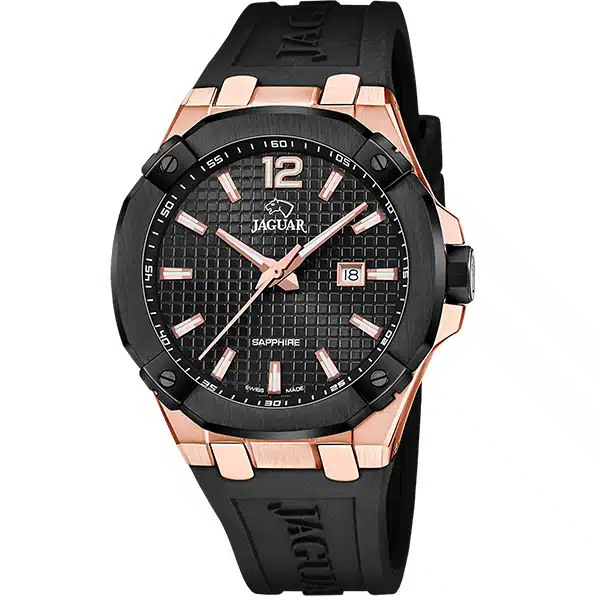 ساعت مچی مردانه جگوار مدل J1013/1 از مجموعه “Diplomatic” یک ساعت سوئیسی (Swiss Made) با طراحی مدرن و جسورانه است که ویژگیهای اسپرت و کلاسیک را در هم آمیخته؛ این مدل دارای موتور کوارتز دقیق روندا، قاب استیل ضدزنگ در رنگ مشکی/رزگلد با قطر بزرگ 43.5 میلیمتری، صفحه مشکی با جزئیات رزگلد و بند سیلیکونی مشکی مقاوم است، همچنین به شیشهی یاقوت کبود ضد خش مجهز بوده و با مقاومت در برابر آب تا 100 متر، گزینهای با دوام و شیک برای استفاده روزانه، شنا و فعالیتهای نیمهسنگین است.