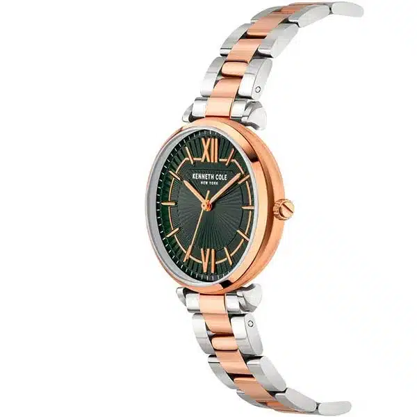 - این مدل یک ساعت مچی عقربهای زنانه از برند کنت کول (Kenneth Cole) و از خانواده MODERN CLASSIC است. دارای طراحی شیک و روزمره با بند و قاب استیل دو رنگ رزگلد-نقرهای و صفحهای به رنگ سبز تیره میباشد. موتور این ساعت کوارتز ژاپنی است، دارای قطر قاب 34 میلیمتر بوده و تا عمق 30 متر در برابر آب مقاوم است.