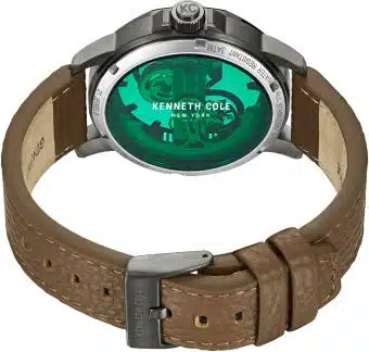 - ساعت Kenneth Cole New York مدل KCWGE0033701 یک ساعت مچی مردانه اتوماتیک (مکانیکی) است که دارای قاب استیل ضد زنگ 41 میلیمتری خاکستری تیره (Gunmetal)، صفحه سبز با طراحی نیمه اسکلتون (Semi-Skeleton) برای نمایش موتور، و بند چرمی قهوهای تیره است که ظاهری کلاسیک، رسمی و چشمگیر دارد و تا ۳۰ متر در برابر آب مقاوم است.