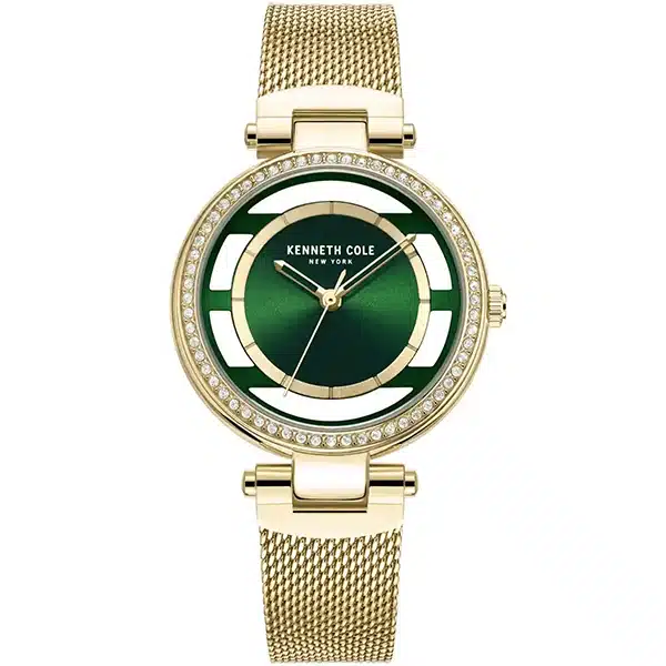 - ساعت KCWLG2219805 یک ساعت مچی زنانه از برند کنت کول (Kenneth Cole) با استایل شیک و چشمگیر است. این مدل از یک موتور کوارتز دقیق نیرو میگیرد و دارای قاب و بند تمام استیل طلایی (Gold-Tone) میباشد. جذابیت اصلی آن در صفحه سبز رنگ ساده و کلاسیک است که ظاهری لوکس و در عین حال متمایز ایجاد میکند و برای افزودن رنگ به استایل روزانه یا مجلسی انتخابی عالی است.
