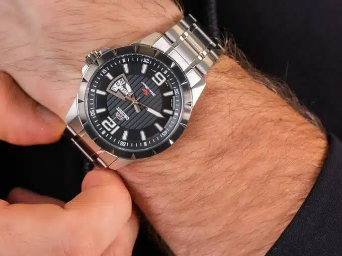 - صفحه مشکی با عقربهها و نشانگرهای واضح، حتی در نور کم نیز به راحتی قابل خواندن است و استفاده روزمره را آسان میکند.
