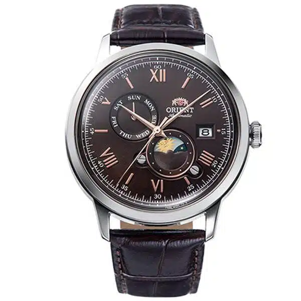 - ساعت مچی اورینت (Orient) رفرنس RA-AK0804Y00C یک ساعت خاص و کلکسیونی است که با ترکیب طراحی کلاسیک ژاپنی و موتور مکانیکی اتوماتیک ساخته شده است. این مدل از سری Sun & Moon اورینت بوده و با صفحهی قهوهای خورشیدی (Sunburst Brown Dial) جلوهای گرم و لوکس دارد. در صفحه، نمایشگر خورشید و ماه در موقعیت ساعت 5 و تقویم روز و تاریخ بهشکلی ظریف و متقارن دیده میشود. بدنهی استیل ضدزنگ در کنار بند چرمی قهوهای اصل، هماهنگی کاملی ایجاد کرده و حس کلاسیک و اصیل را منتقل میکند. شیشهی یاقوت مصنوعی (Sapphire Crystal) مقاومت بالایی در برابر خط و خش داشته و قلب تپندهی ساعت یعنی کالیبر F6B24 با 40 ساعت ذخیره انرژی عملکردی مطمئن و دقیق ارائه میدهد. این ساعت با قطر 42.5 میلیمتر و مقاومت در برابر آب تا 50 متر، انتخابی ایدهآل برای کسانی است که به دنبال ترکیبی از اصالت سنتی و کارکرد مدرن هستند.