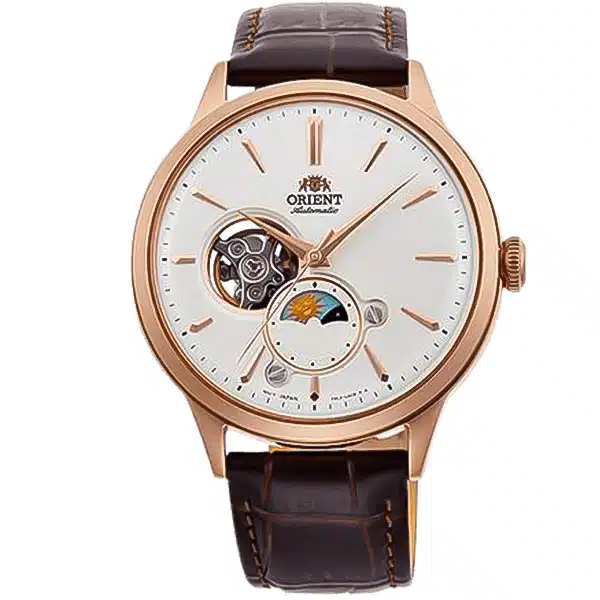 - ساعت برند اورینت ORIENT RA-AS0102S یک ساعت کلاسیک و بسیار جذاب است که با طراحی خاص خود توجه هر بینندهای را به خود جلب میکند. این مدل مجهز به یک موتور مکانیکی اتوماتیک (Automatic Movement) با قابلیت کوک دستی است که عملکردی دقیق و بدون نیاز به باتری را تضمین میکند. یکی از برجستهترین ویژگیهای این ساعت، نمایشگر قلب باز (Open Heart) روی صفحه است که به شما امکان مشاهده عملکرد ظریف و پیچیده موتور را میدهد. این ساعت همچنین دارای یک نمایشگر روز و شب (Day/Night Indicator) است که به صورت یک خورشید و ماه در حال حرکت نمایش داده میشود و زیبایی خاصی به آن میبخشد. صفحه ساعت توسط یک شیشه یاقوت کبود (Sapphire Crystal) مقاوم در برابر خط و خش محافظت میشود. علاوه بر این، مقاومت در برابر آب تا عمق ۵۰ متر و بدنهی از جنس استیل ضد زنگ، این ساعت را به گزینهای شیک، بادوام و مناسب برای استفاده روزمره تبدیل کرده است.