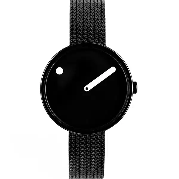 - طراحی متمایز: یکی از مهمترین ویژگیهای ساعت پیکتو، از جمله این مدل، طراحی بسیار ساده و مینیمال صفحه است. در این ساعتها به جای نشانگرهای سنتی، زمان به صورت یک “پیکتوگرام” (نماد زمان در حال حرکت) نشان داده میشود که برای کسانی که به دنبال سبکی خاص و هنری هستند، جذاب است.