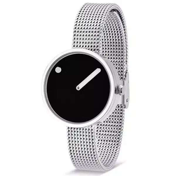 - خوانایی منحصر به فرد: این ساعت با حذف عقربههای سنتی و استفاده از یک نقطه (برای ساعت) و یک خط (برای دقیقه) روی یک صفحه چرخان، یک سبک ساعتخوانی کاملاً متفاوت و جذاب را ارائه میدهد که امضای خاص برند پیکتو است.