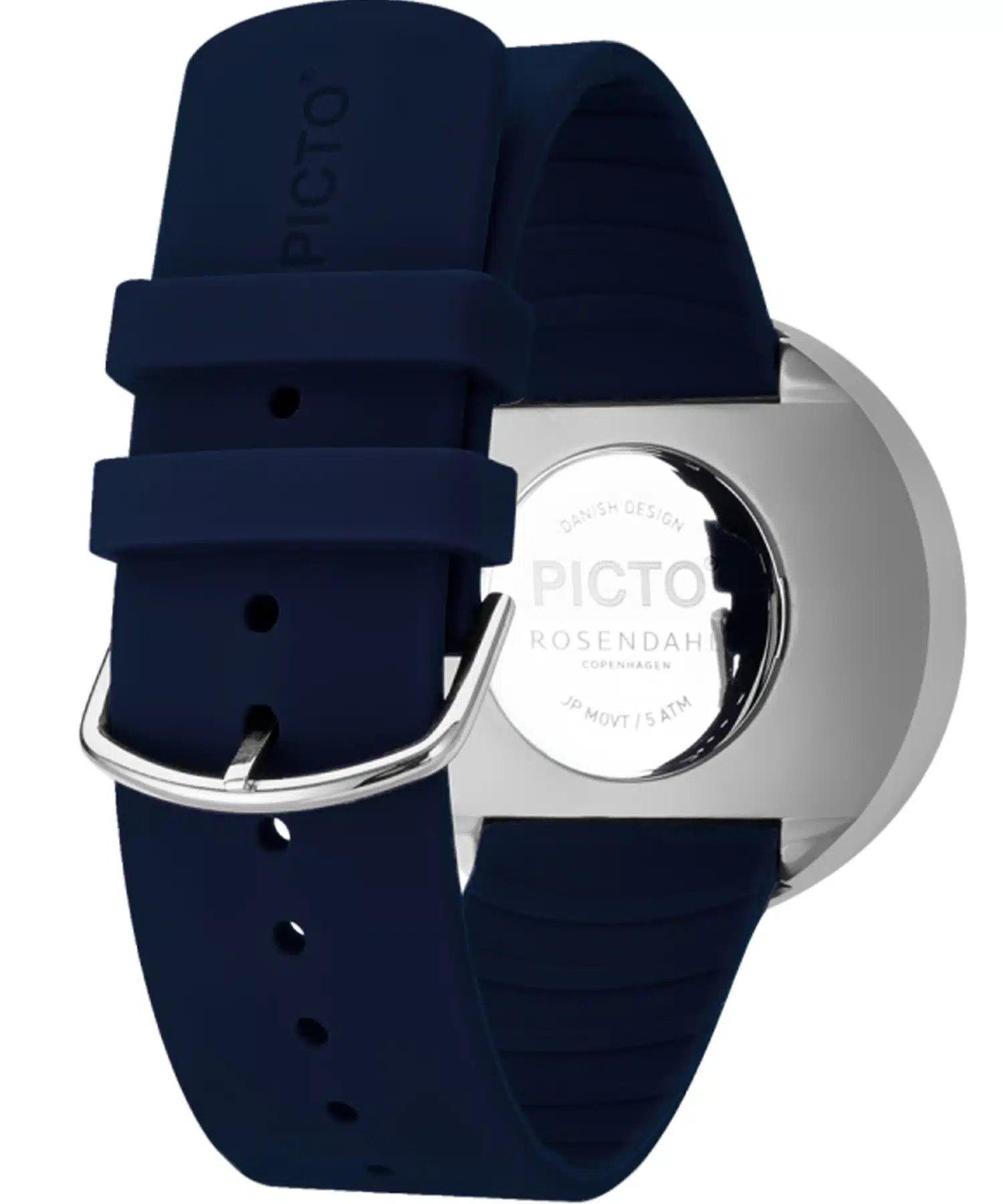 ساعت مچی پیکتو مدل P43393-0520S یک ساعت یونیسکس (مردانه و زنانه) با طراحی مینیمال دانمارکی است که بر پایه کنتراست رنگهای نقرهای و سرمهای ساخته شده است. این مدل دارای قاب ۴۰ میلیمتری استیل ضدزنگ نقرهای صیقلی و صفحه نمایش سرمهای عمیق است که زمان را به روش نمادین پیکتو (با یک نقطه چرخنده برای ساعت و یک عقربه خطی برای دقیقه) نمایش میدهد. بند آن از جنس سیلیکون (یا رابر/TPU) به رنگ سرمهای همرنگ صفحه است که راحتی و مقاومت بالا را برای استفاده روزمره و اسپرت فراهم میکند، همچنین با موتور کوارتز ژاپنی (Miyota) و مقاومت ۵۰ متر در برابر آب، به یک اکسسوری مدرن و ساده تبدیل شده است.