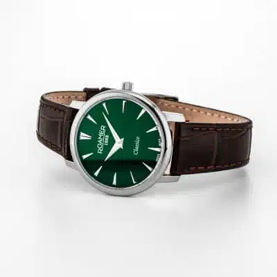 ترکیب رنگ جذاب: صفحه سبز تیره (Deep Green Dial) در کنار بدنه نقرهای و بند چرمی قهوهای، یک ترکیب رنگی خاص و لوکس ایجاد میکند که جلوه ویژهای به استایل شما میدهد.