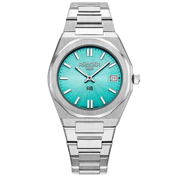 زیبایی همهکاره: طراحی آن کلاسیک، شیک و مینیمال است. صفحه آبی روشن (Light Blue Sunray) یا فیروزهای، در کنار قاب و بند استیل نقرهای، ظاهری جذاب و در عین حال متعادل ایجاد میکند که برای استایل روزمره، کاری و مجلسی مناسب است.