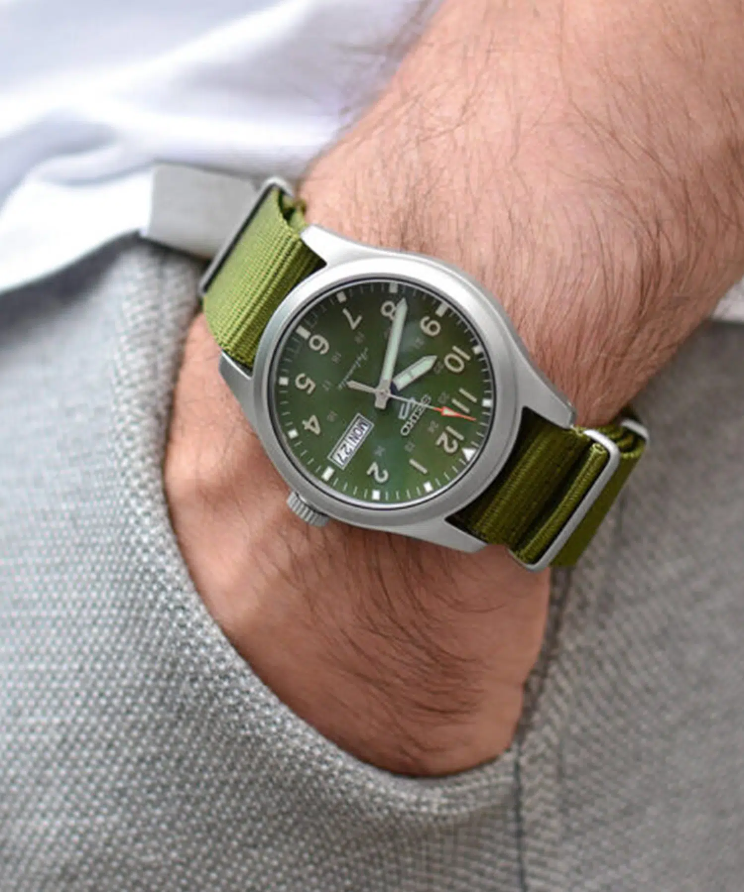 - ساعت مچی مردانه سیکو مدل SRPG33K1، انتخابی بینظیر برای آقایانی است که به دنبال یک ساعت کلاسیک و مقاوم با قابلیتهای مدرن هستند. این ساعت از سری محبوب “Seiko 5 Sports” با الهام از طراحی ساعتهای نظامی (Field Watch)، دارای بدنهای مستحکم از استیل ضد زنگ و بندی پارچهای به رنگ سبز نظامی است. موتور اتوماتیک قابل اعتماد کالیبر 4R36، شیشه هاردلکس مقاوم در برابر خش و مقاومت در برابر آب تا عمق 100 متر، این مدل را به یک همراه ایدهآل برای استفاده روزمره و ماجراجوییهای شما تبدیل میکند. طراحی خوانا، شبنمای قوی و نمایشگر تاریخ و روز، کاربری آن را در هر شرایطی آسان میسازد. با خرید این ساعت، زیبایی، دوام و دقت را به مچ دست خود هدیه دهید.