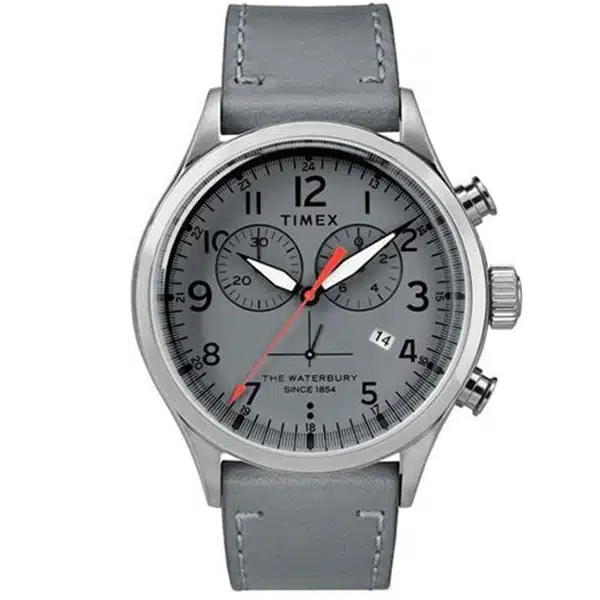 1. طراحی کلاسیک و شیک:- این ساعت با طراحی مینیمال و صفحهنمایشی که دارای کرونوگراف و نمایشگر تاریخ است، ظاهری رسمی و در عین حال مدرن دارد. رنگبندی طوسی صفحه و بند چرمی آن، به راحتی با استایلهای مختلف از جمله روزمره و کژوال ست میشود.