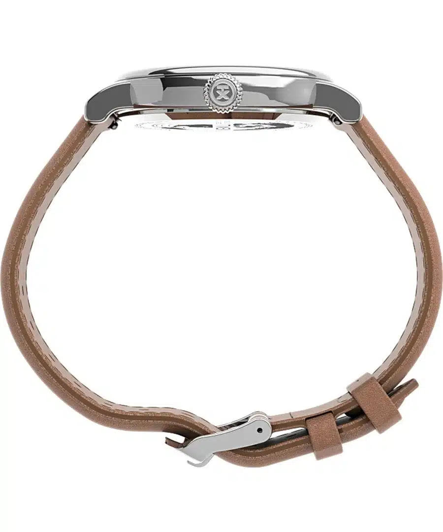 - بند چرم قهوهای با عرض ۱۸ میلیمتر نرم و منعطف است و استفاده طولانی مدت را راحت میکند، همچنین به زیبایی کلاسیک ساعت میافزاید.