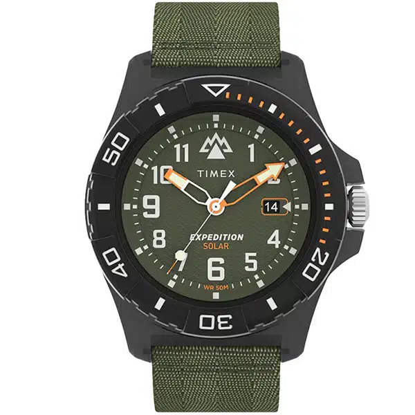 ساعت مچی تایمکس (Timex) رفرنس TW2V40400 از سری Expedition North Freedive Ocean، یک ساعت تخصصی و محیط زیستی است که با الهام از طبیعت طراحی شده است. این ساعت با قاب ۴۶ میلیمتری از جنس پلاستیک بازیافتی از اقیانوسها ساخته شده که به کاهش آلودگی پلاستیکی کمک میکند. مهمترین ویژگی آن، بهرهگیری از موتور کوارتز سولار است که با جذب نور، نیاز به تعویض باتری را از بین میبرد و آن را به یک ابزار پایدار و کمهزینه تبدیل میکند. همچنین، بند پارچهای آن دوام و راحتی بالایی برای استفاده در محیطهای مرطوب فراهم میکند. علاوه بر این، مقاومت در برابر آب تا ۵۰ متر (۵ اتمسفر) و عقربههای شبنما (Luminous)، کارایی این ساعت را در شرایط مختلف افزایش میدهد. این مدل ترکیبی از فناوریهای نوین، طراحی هدفمند و تعهد به محیط زیست است.