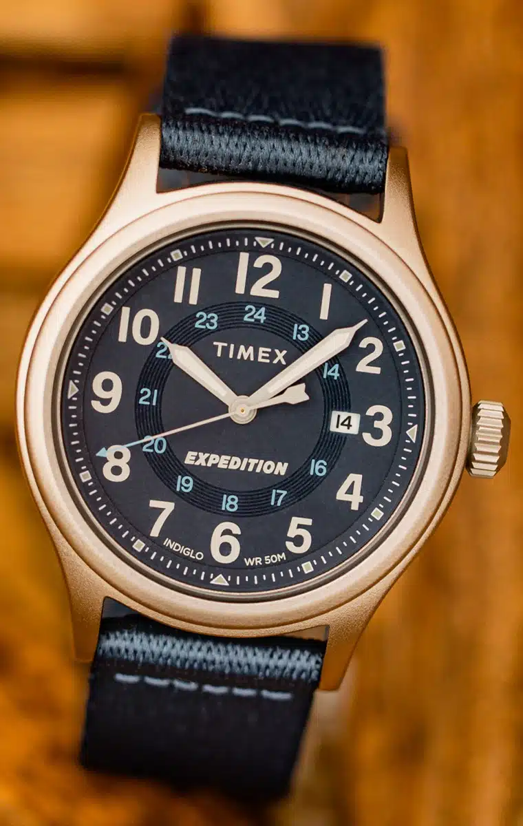 - برند ساعت تایمکس با صفحهی آبی سرمهای و اعداد بزرگ و خوانا، ظاهری شبیه ساعتهای میدانی (Field Watch) دارد که هم برای استایل روزمره و هم برای موقعیتهای بیرونی مناسب است. طراحی مینیمال و کاربردی باعث شده خوانایی بالایی حتی در یک نگاه داشته باشد.