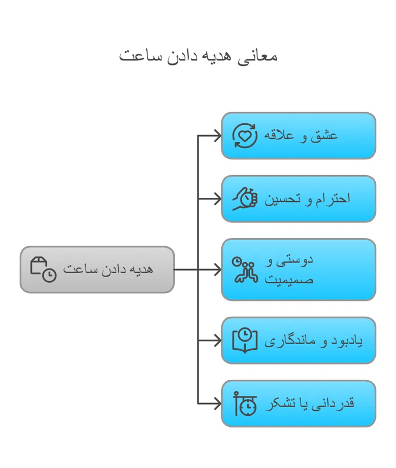 هدیه دادن ساعت میتواند نماد عشق، احترام، یادبود، قدردانی یا یادآوری باشد. این معنا بستگی به نیت هدیهدهنده و نوع رابطه دارد.